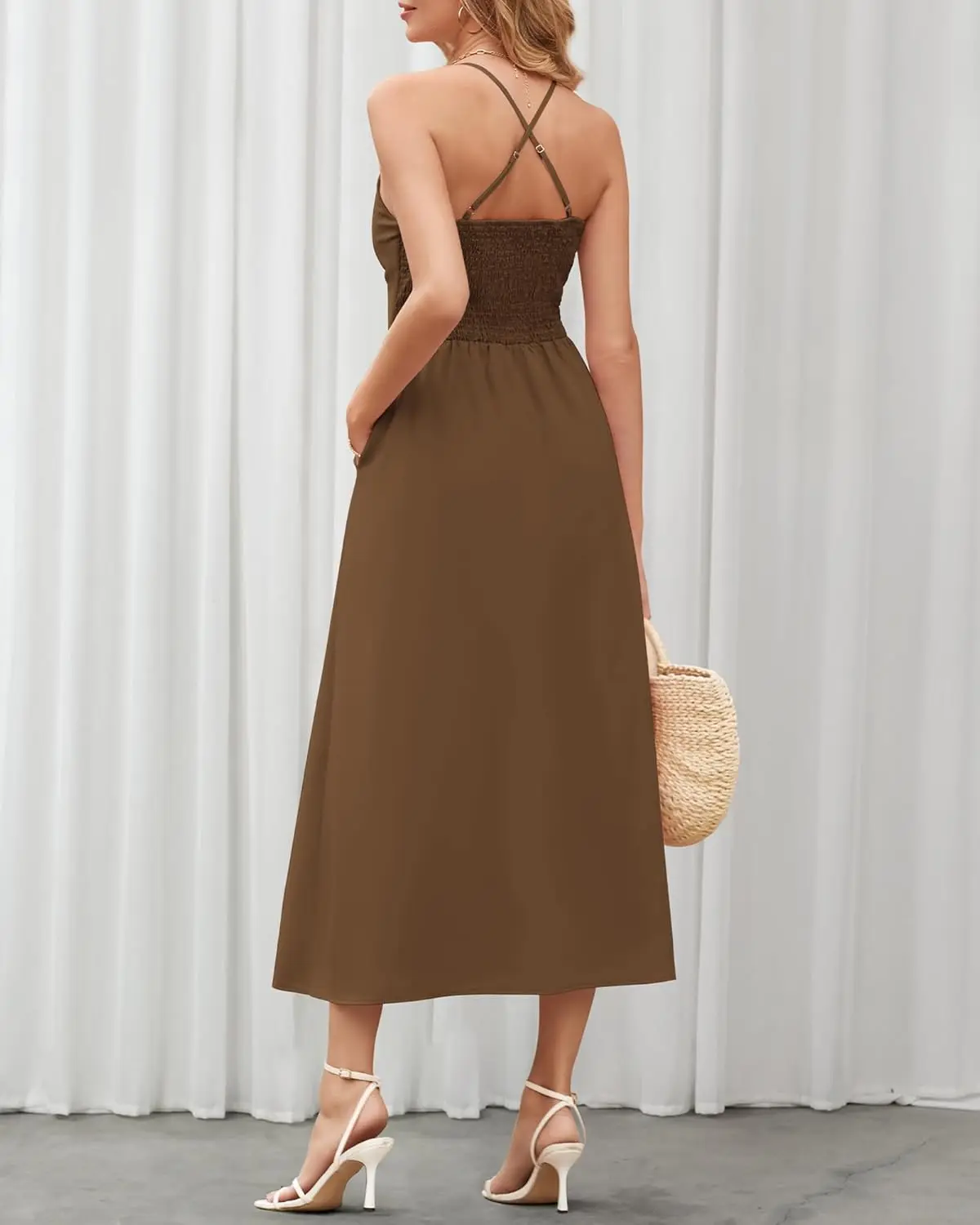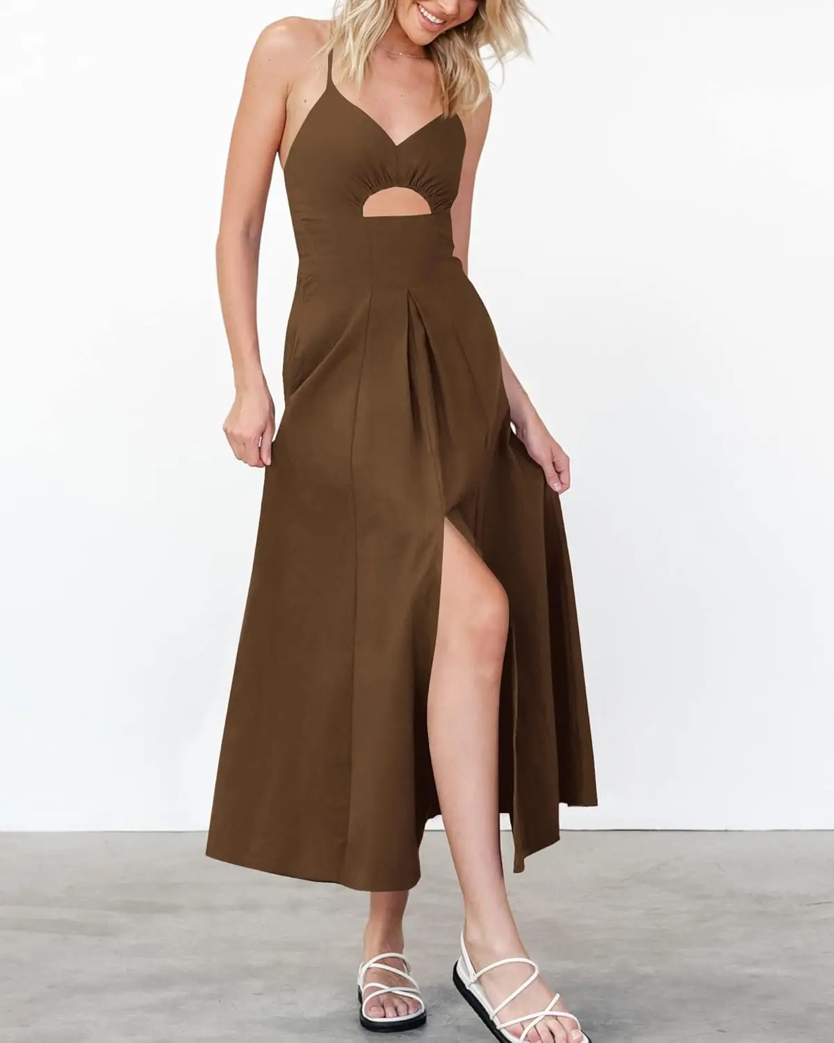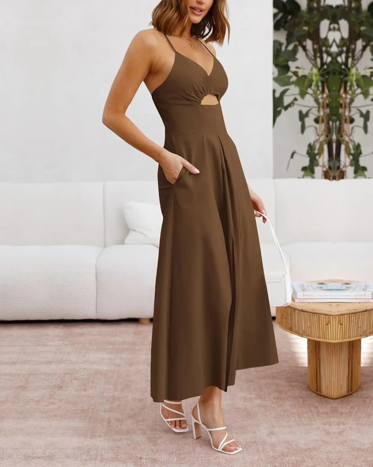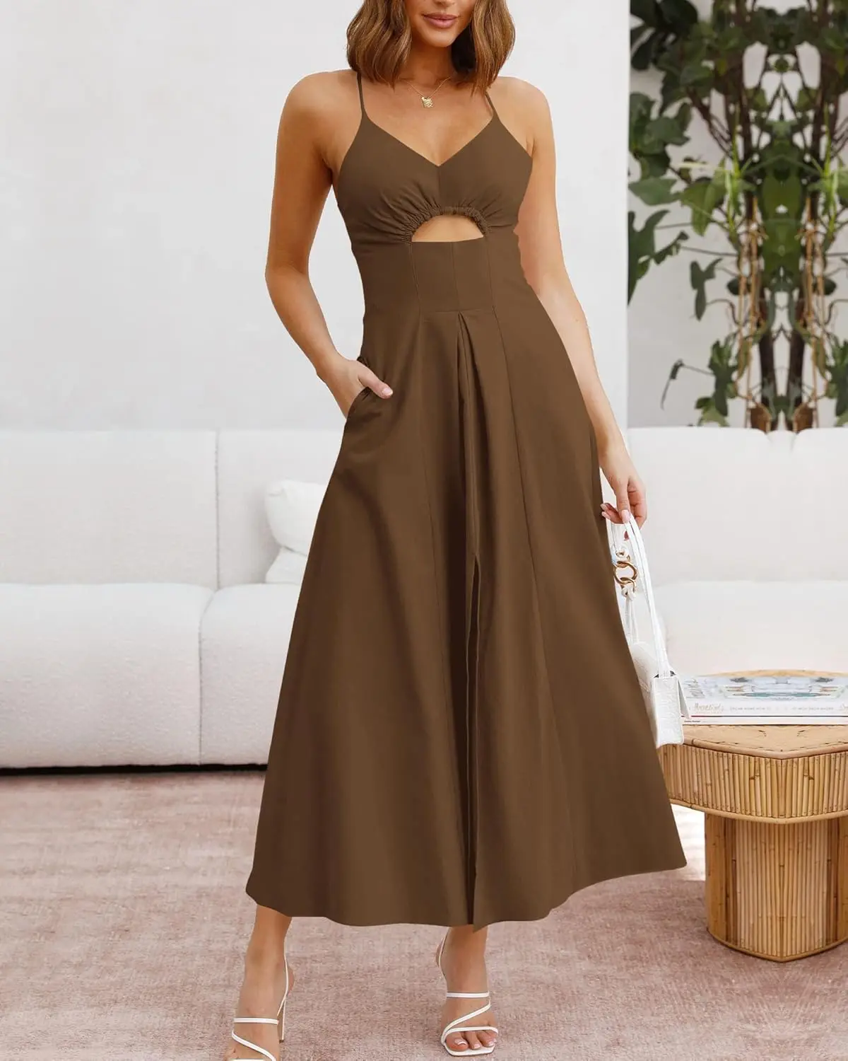 Women's 2025 Summer Sleeveless V-Neck Cutout Maxi Dress Chiffon Beaded Spaghetti Strap Casual Beach Party Floor-Length Natural
